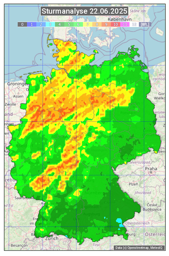 Die Sturmanalyse vom 22.06.2025 zeigt die maximalen Windböen des Tages. Die Angabe erfolgt als Windstärke in Beaufort.