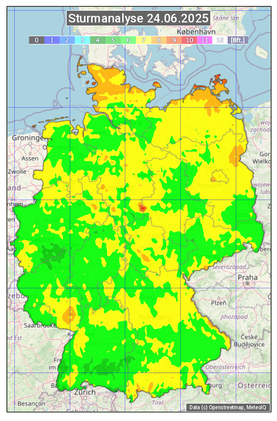 Die Sturmanalyse vom 24.06.2025 zeigt die maximalen Windböen des Tages. Die Angabe erfolgt als Windstärke in Beaufort.