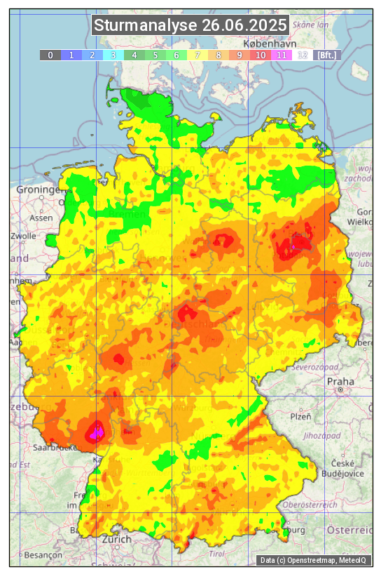 Die Sturmanalyse vom 26.06.2025 zeigt die maximalen Windböen des Tages. Die Angabe erfolgt als Windstärke in Beaufort.