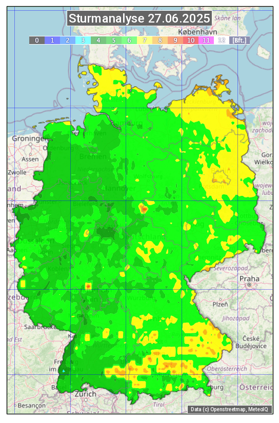 Die Sturmanalyse vom 27.06.2025 zeigt die maximalen Windböen des Tages. Die Angabe erfolgt als Windstärke in Beaufort.