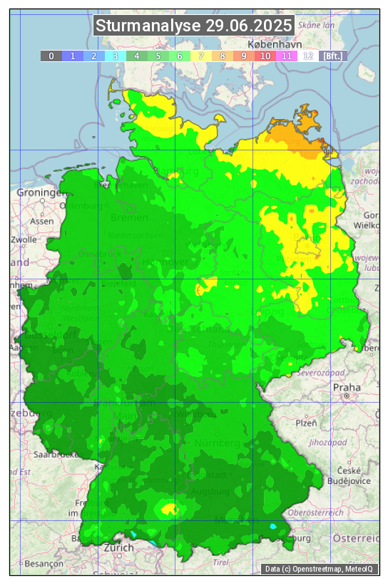 Die Sturmanalyse vom 29.06.2025 zeigt die maximalen Windböen des Tages. Die Angabe erfolgt als Windstärke in Beaufort.