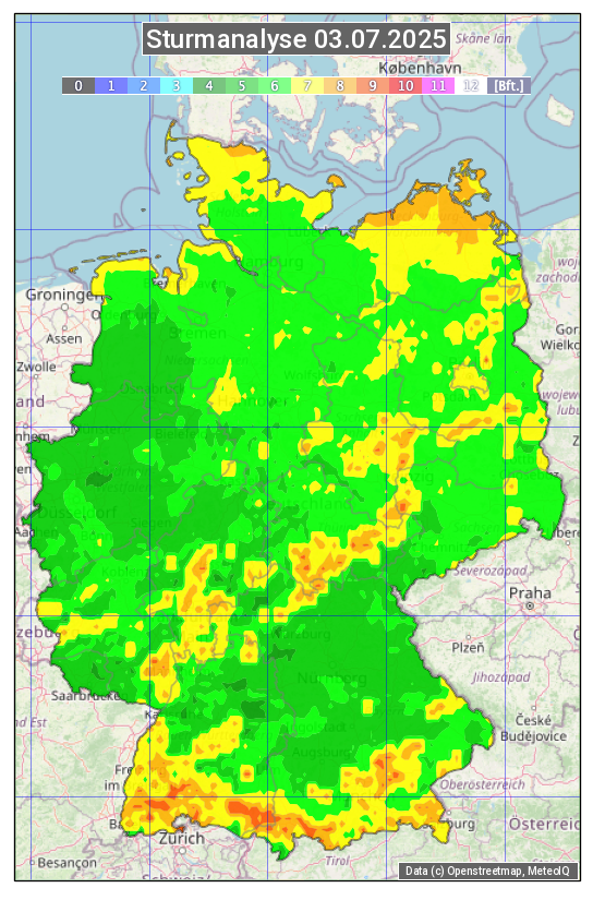 Die Sturmanalyse vom 03.07.2025 zeigt die maximalen Windböen des Tages. Die Angabe erfolgt als Windstärke in Beaufort.