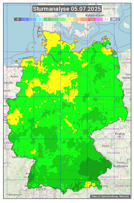 Die Sturmanalyse vom 05.07.2025 zeigt die maximalen Windböen des Tages. Die Angabe erfolgt als Windstärke in Beaufort.
