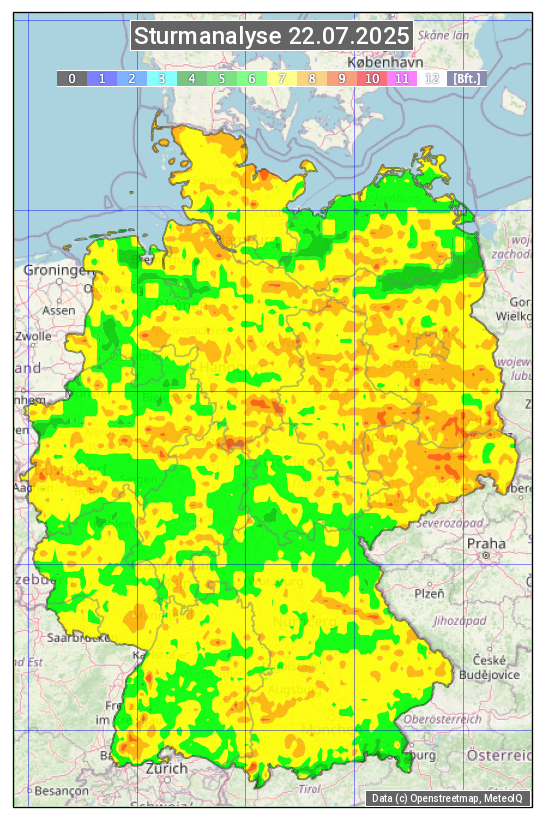 Die Sturmanalyse vom 22.07.2025 zeigt die maximalen Windböen des Tages. Die Angabe erfolgt als Windstärke in Beaufort.