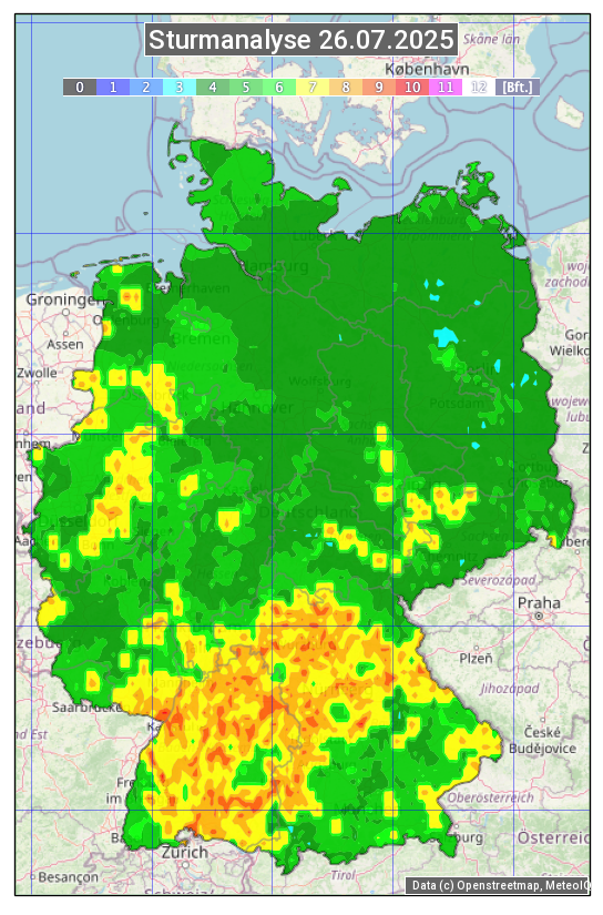 Die Sturmanalyse vom 26.07.2025 zeigt die maximalen Windböen des Tages. Die Angabe erfolgt als Windstärke in Beaufort.