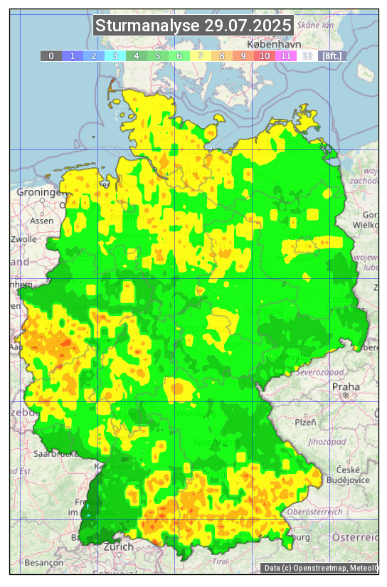 Die Sturmanalyse vom 29.07.2025 zeigt die maximalen Windböen des Tages. Die Angabe erfolgt als Windstärke in Beaufort.