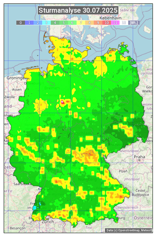 Die Sturmanalyse vom 30.07.2025 zeigt die maximalen Windböen des Tages. Die Angabe erfolgt als Windstärke in Beaufort.