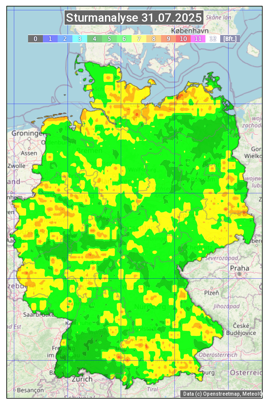 Die Sturmanalyse vom 31.07.2025 zeigt die maximalen Windböen des Tages. Die Angabe erfolgt als Windstärke in Beaufort.